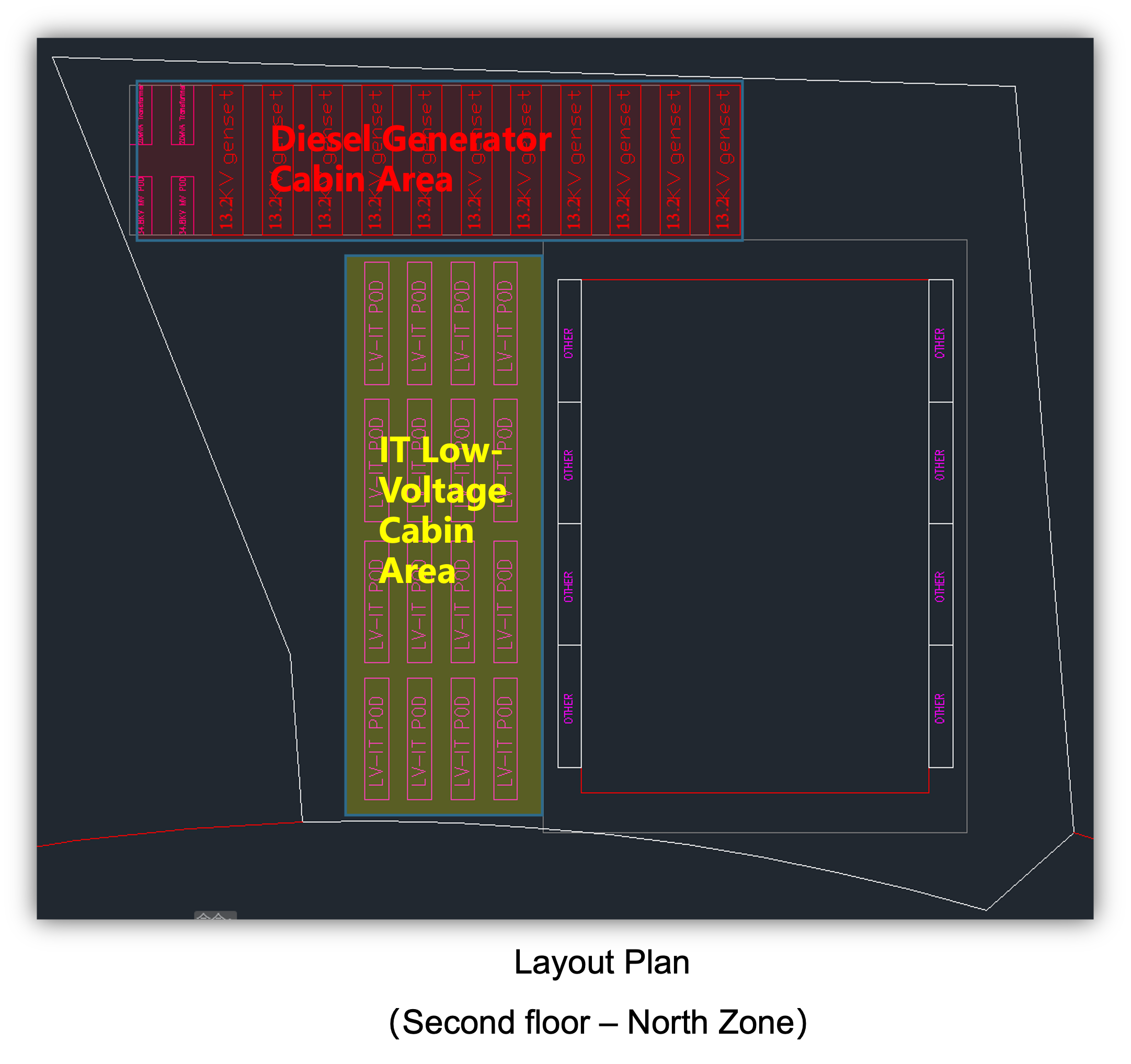All LV-IT PODs supplying power to the IT cabins in the North Zone are located on the second-floor steel platform within the North Zone.
